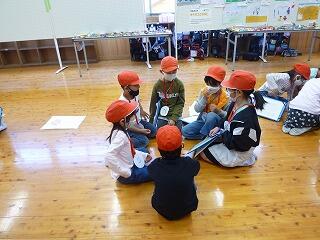 自己紹介をして、その後、班の名前や共遊の遊びを決めました。その話し合いでは、6年生が進行を務め、班のメンバーから意見を求めました。途中で相談の時間を設けると、6年生が1,2年生の話し合いに入って助けてあげている場面も見られ、リーダーとしての責任を果たす頼もしさが感じられました。それぞれの班の仲間意識が高まったことと思います。