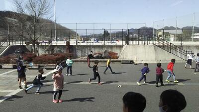 すがすがしく爽やかない陽気の中で、業間や昼休みは外で元気に遊ぶ子どもたち。