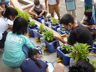 児童昇降口周りには、児童が育てている花や作物などが置かれています。朝、登校してきた児童は、自ら進んで水やりをしています。ここ3,4日暑い日が続いているので、水をかけてもらった花や作物は生き生きとして嬉しそうに見えました。
