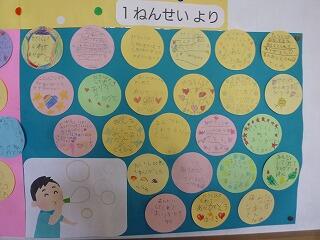 2年生の廊下の壁には、1年生と「なかよし会」をしたお礼のメッセージカードが飾ってあります。その時に優しく案内してもらった各教室を、今度は1年生が自分たちだけで探検に行きます。その準備、練習も着々と進んでいるようです。