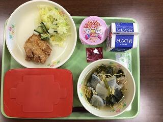 4月25日(木)、今日の給食は、「入学おいわい献立」でした。メニューは、黒米ご飯、ごま塩、コールスロー、とりにくのから揚げ、すまし汁、おいわいゼリー、牛乳でした。子どもたちの好きなから揚げや、ゼリーが並び、子どもたちもとてもうれしそうでした。1年生の教室に行くと、「もぐもぐタイム」の時間で、おいしそうに給食を食べていました。