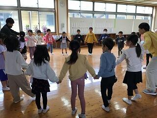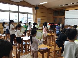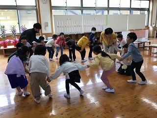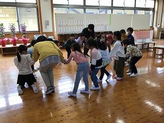 4月22日(月)、博貫スペースに行ってみると、1年生が、「ひらいたひらいた」の曲に合わせて、楽しそうにわらべ歌遊びをしていました。みんなですぼんでみたり、ひらいてみたり、歌を口ずさみながら、とても楽しそうでした。