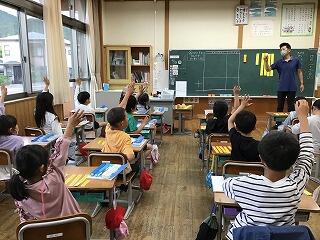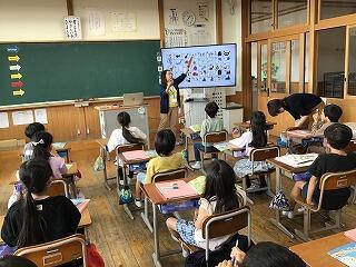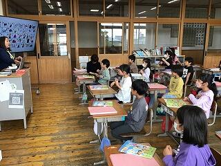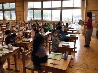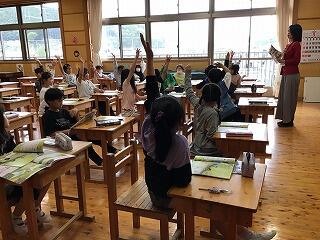 4月22日(月)、3年生の教室では、外国語活動の授業をしていました。3年生になると、外国語活動の授業が、週1時間あります。児童は、ALTの発音をよく聞きながら、ジェスチャーを付けて発音の練習をしていました。そのあとは、絵の中に描かれているものを、英語で答えていました。いろいろな単語を知っていて感心しました。