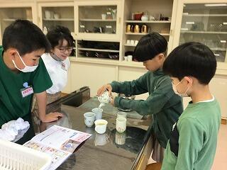 4月19日(金)、5年生は、家庭科の授業でお茶の入れ方を学び、実習していました。お湯を沸かし、急須に茶葉を入れ、お湯を入れて、頃合いを見て湯のみにお茶を注ぎます。ごちそうになりましたが、とてもおいしかったです。ぜひ、家でも実践してほしいと思います。