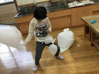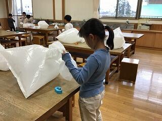 4月23日(火)、3年生は、図工室で図工の授業をしていました。袋の中に空気を詰め込み、いろいろな形を作っていました。様々な発想で、大きさや形を工夫しながら、楽しく造形遊びをしていました。