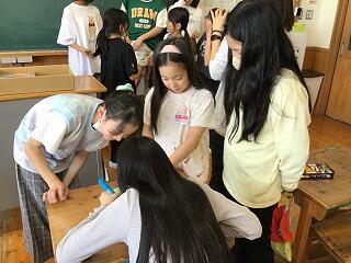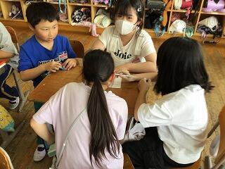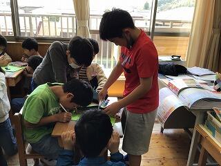 4月15日(月)、4年生の教室では、理科の学習をしていました。磁石についての学習です。磁石と磁石の間に、紙をはさんだり、ノートをはさんだり、辞書をはさんだりしながら、互いに引き合う力がどうなるか試していました。児童は、予想を立てながら、わくわくしながら結果を見ていました。