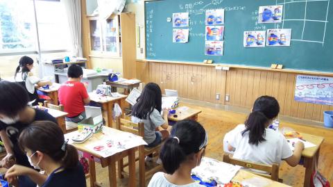2年生 図工の水彩画で使った絵の具を洗っているところ