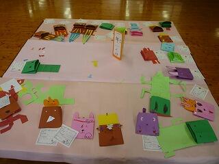 1階の博貫スペースには、1年生の「あそぼうよ パクパクさん」をテーマに作った作品が展示してありました。一人一人の思いやアイディアがたくさん詰まった作品がところ狭しと並んでいました。楽しみながら夢中になって作った様子が浮かんできます。