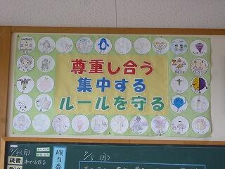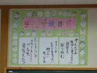どれも手作り感があり、手形や足形、似顔絵や好きなキャラクター、顔写真などが学級目標を囲み、一人一人の学級への所属感が表れています。目標も学級活動で話し合って決めたもので、、時々、「目標に近づいているかな。」「今日の頑張りはこの目標に向かっていたね。」などと振り返っています。