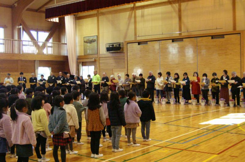 児童代表挨拶に始まり、校長の話、感謝の手紙とプレゼントの贈呈、ボランティア代表の方のお話、全校児童による歌のプレゼント、参加者全員で校歌を歌うという流れで会は行われました。