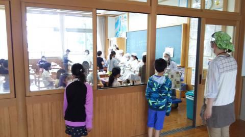 その後は、午前中の授業を行い給食の準備になりました。まずは、水道で手洗いをします。間をあけて、順番に洗います。その後は、フェイスシールドを付けた給食当番と先生が給食を分けました。子ども達は、待っているときも、間をあけて待ちました。