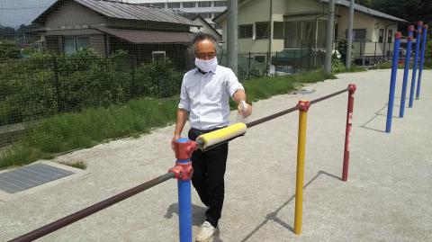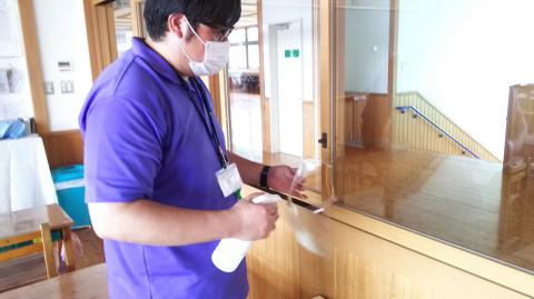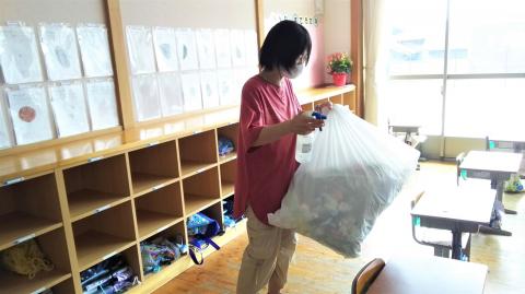学校では、児童下校の後などに、校内の消毒やトイレ掃除を教員が行っております。また、給食の白衣は、学校で洗濯し、管理したものを使用し、感染予防に努めております。