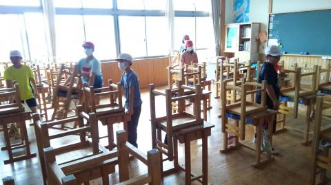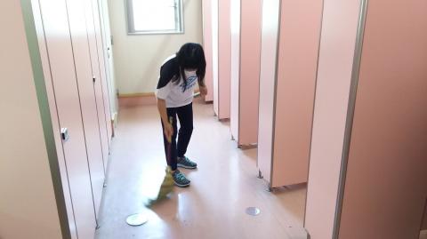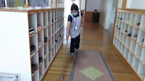 学校では、児童下校の後などに、校内の消毒やトイレ掃除を教員が行っております。また、給食の白衣は、学校で洗濯し、管理したものを使用し、感染予防に努めております。