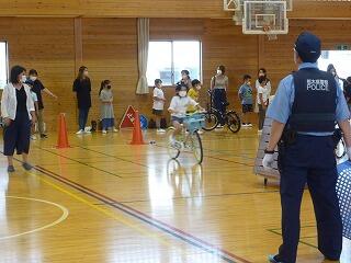 警察の方や市の交通安全課の方にご指導いただきながら、DVDを視聴して自転車の正しい乗り方を理解したり、体育館で実際に自転車に乗って注意点を確認したりしました。親子で学ぶことで、安全で正しい自転車の乗り方に一層の関心と理解が深まったことでしょう。また、子どもたちにとって、おうちの方と一緒に学ぶ機会は、心温まるものになったことと思います。