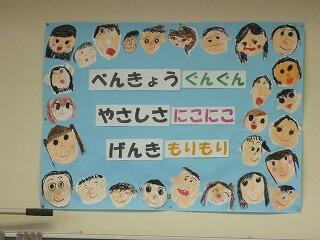 どれも手作り感があり、手形や足形、似顔絵や好きなキャラクター、顔写真などが学級目標を囲み、一人一人の学級への所属感が表れています。目標も学級活動で話し合って決めたもので、、時々、「目標に近づいているかな。」「今日の頑張りはこの目標に向かっていたね。」などと振り返っています。