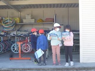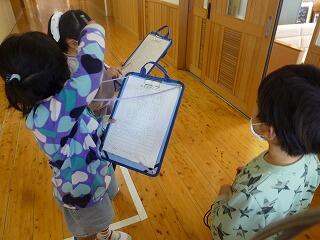 1年生が探検バックを首に下げて、何やら一生懸命に探していました。ワークシートには「かずさがしビンゴ」とありました。算数「おおきなかず」の単元で、身の回りから大きな数を探す学習をしていました。子どもたちは、いろいろな教室へ行ったり校庭に出たりして、大きな数の物を見つけて夢中になって数えていました。「ランドセルが28」「さくひんが90」「おてがみボックスが30」「おんがくしつのかおが19」「ブランコのあな96」「フラフープ28」など、進んで見つけては、ワークシートに書き込んでいました。「大きな数は、私たちの周りにこんなにあるんだ。」ということを体感する生活に結び付いた学習です。