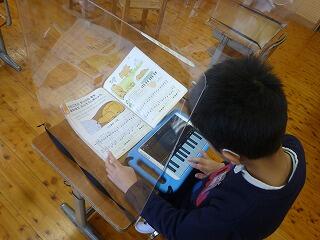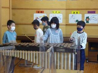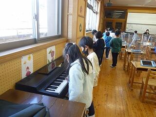 2年1組は、オルガンやピアノ、木琴などを使って「こぐまの二月」の練習をしていました。音楽室の広いスペースに置いた楽器へと移動しながら、進んで練習に励んでいました。なかにはタブレットの鍵盤キーを使って運指の確認をする児童もいました。自分で練習方法や楽器を選びながら、曲をマスターしようとする前向きな姿がありました。