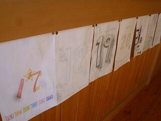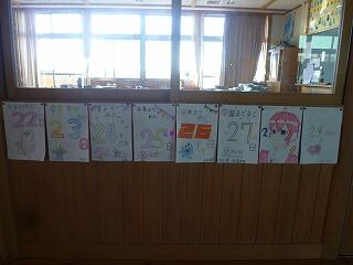 教室をまわっていると、6年生各クラスの廊下の壁に、数字の入った紙が並んでいました。数字は、卒業式までに学校へ来る日数であることはすぐに分かりました。その紙には、数字と共に自分の好きなイラストや思い出の絵が思い思いに描かれていました。