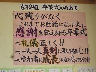 6年生は、残りわずかな小学校生活を、一日一日大事に過ごしています。その想いに応えようと、担任の愛情あふれる関わりがひしひしと伝わってきます。その一つが「卒業式のめあて」です。子どもたちが話し合って決めためあてが、一文字一文字心を込めて、筆で書いてありました。子どもたちの想い、そして担任の想いがあふれた教室を見ると、こちらまで胸がジーンと熱くなりました。