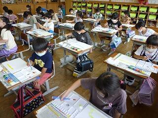 1年生の教室では、子供たちが集中して学習に取り組んでいました。