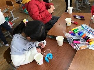1年生は、園児へのプレゼントにしようと、松ぼっくりを使ったけん玉を作っていました。心を込めて絵を描いて、タコ糸を縛り付け、一生懸命つくっていました。招待した園児の皆さんが喜んでくれるといいなと思います。