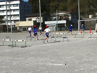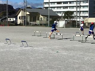 4年生は、校庭でハードル走の練習をしていました。リズムよくハードルをまたぎ越すのが上手になっていました。