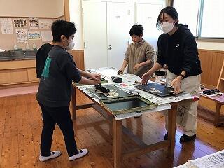 12月19日(木)、6年生は図工でスチレン版画を刷っていました。1回刷ってみて、出来上がりを確認し、もう一度版を修正して刷りなおしている子もいました。それぞれの個性が光っていて、とてもすてきな作品が出来上がりました。