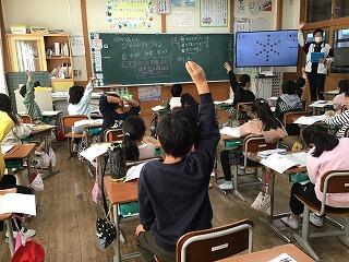 5年生の教室では、算数の復習をしていました。集中して練習問題に取り組み、自分の考えを黒板に書いて発表したり、不確かな部分を友達と確認したりしていました。自分から学ぶ力もついているようです。