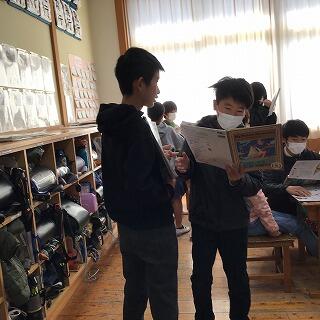 12月13日(金)、今日は朝の会の時間に5年生が2年生の教室を訪れ、2年生にメッセージカードをプレゼントしていました。一緒に活動する中で見つけた2年生の頑張りをカードに記して渡していました。受け取った2年生は、とてもうれしそうにメッセージカードを読んでいました。読み終わると、「宝物ファイルに入れたい。」と言って宝物ファイルにしまったり、「家に持ち帰ってお家の人に見せたい。」と大事そうに連絡袋にしまったりしていました。素敵な心の交流が図れたようです。