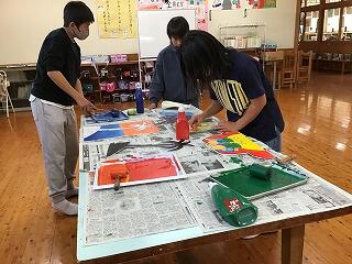 5年生は、図工で木版画に取り組んでいました。自分でインクを板に付けて、上手に刷り上げていました。