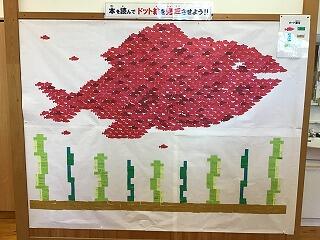 読書週間に「みんなで1000冊本を読もう」と、呼びかけていた図書委員会の取組が、ついに本日完結しました。読書週間中に本を借りた児童が、一つ一つのパーツに名前を書き箱の中に入れていたものを、図書委員会の児童が用紙に貼り、本日無事に貼り絵が完成しました。全校児童の協力で仕上がった貼り絵です。これからもたくさん本を読んでいきましょう。
