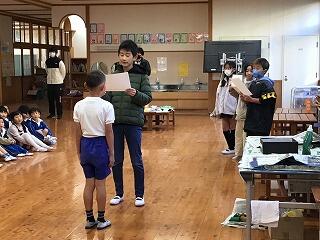 12月20日(金)、計画委員会が企画したブロックごとのあいさつ表彰が行われました。1・2年生ブロックの集会を担当したのは5年生の計画委員です。計画委員から、いつも挨拶を元気にしている児童に賞状が渡されました。「これからも元気なあいさつをしていきましょう。」という呼びかけに、1・2年生児童も大きな声で返事をしていました。計画委員の頑張りで、あいさつ運動がますます広がっていきそうです。