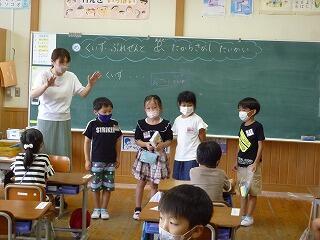 「おおきなかぶ」と「おむすびころりん」のお話を3つのグループになって練習し、発表しました。「おおきなかぶ」では、お面を付け、動作化しながら行いました。自分たちで決めた目標「ちょうどよい声の大きさ」で「ゆっくりていねいに」発表することができました。また、発表を聞いた感想もしっかり述べることができました。できるようになったことがグーンと増えた1学期でした。
