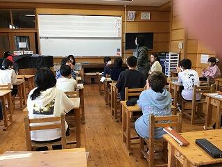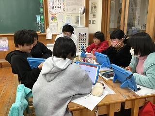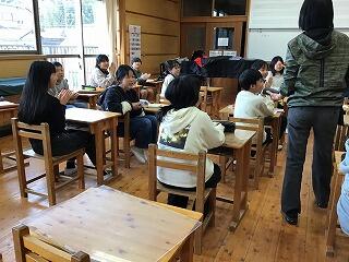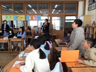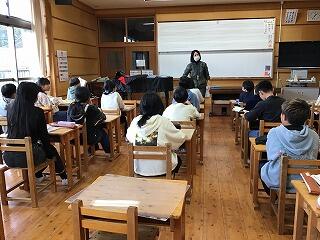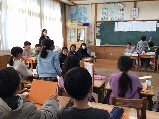 5年生は、音楽の時間にリズム遊びをしていました。お題は「冬休み」です。冬休みで思いつく言葉を先生がしましたリズムに乗せて言います。いろいろな言葉がリズムにのせて伝えられていました。