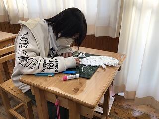 6年生の教室では、スチレン版画に取り組んでいました。出来上がりをイメージしながら、スチレンボードに凹凸を付けたり、細かく切り抜いて版をつくったり、自分で考え工夫しながら作品づくりに取り組んでいました。色を付けて刷り上がると、うれしそうな表情。さらに工夫を加えて、次の作品を刷る児童の姿も見られました。