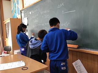 5年生の教室では、算数の復習をしていました。集中して練習問題に取り組み、自分の考えを黒板に書いて発表したり、不確かな部分を友達と確認したりしていました。自分から学ぶ力もついているようです。