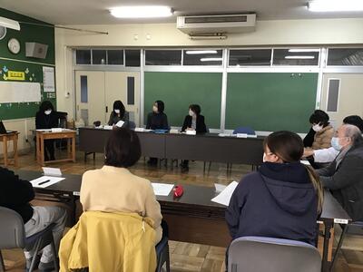 2つめの会議は、来年度から始まるコミュニティ・スクールの運営に関わる「学校運営協議会」の設立準備の会合です。和やかな自己紹介を経て、地域と学校の関係性を確認し合う話し合いをしました。