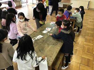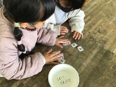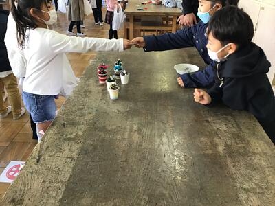 11月19日の本HP「学校ニュース」で取り上げた1年生生活科の「あきのたからものランド」が、昨日から3校時を使って、1クラスづつ明後日まで行われています。2年生に招待状を送り、お客さんになってもらい、模造のお金で買い物をしてもらいます。職員室にも招待状が届き、何名かの職員も買い物に行きました。