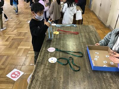 1年生達は、自慢の手作りの作品を並べ、「いらっしゃいませ〜」「1つ(1回)100円で〜す」と元気にお店屋さんをやっていました。木の葉や木の実など身近なもので、秋らしさ、クリスマスらしさをあしらった小物やおもちゃ、ゲームを作り、各教科を横断する学びの成果の発表と、模擬店の運営という形式でのコミュニケーション力の育成を図っていました。
