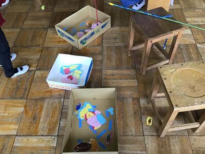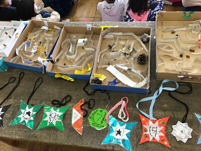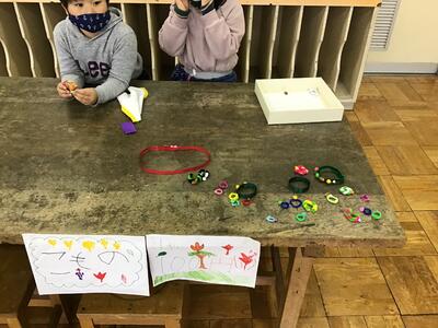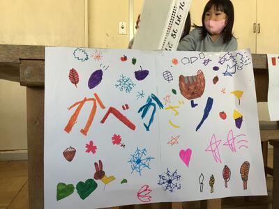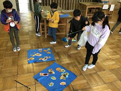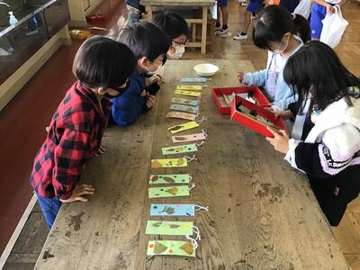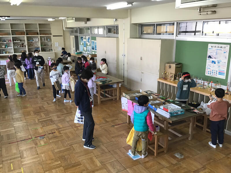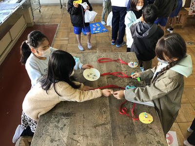 今日の3校時、図画室で行われた1年生と2年生の「あきのたからものランド」の様子です。