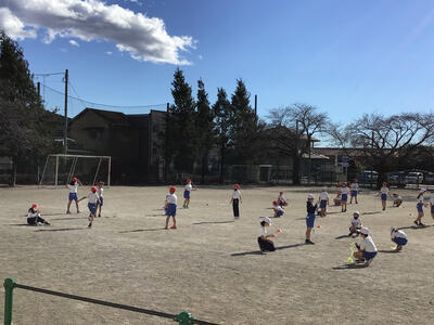 体育の授業では、冒頭に縄跳びを取り入れて身体を温めてから主な学習に入っています。
