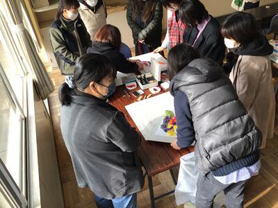 学期末で超多忙な学校にとって本当にありがたい支援となっています。経験者も初めての方もいらっしゃいますが、共同作業を通じて要領を得ていくようです。両面テープを使って台紙に作品を固定する際は、テープを大量に使用するため、節約との兼ね合いの中で作業をしてくださっています。ボランティアの皆様、2日間大変お世話になります。