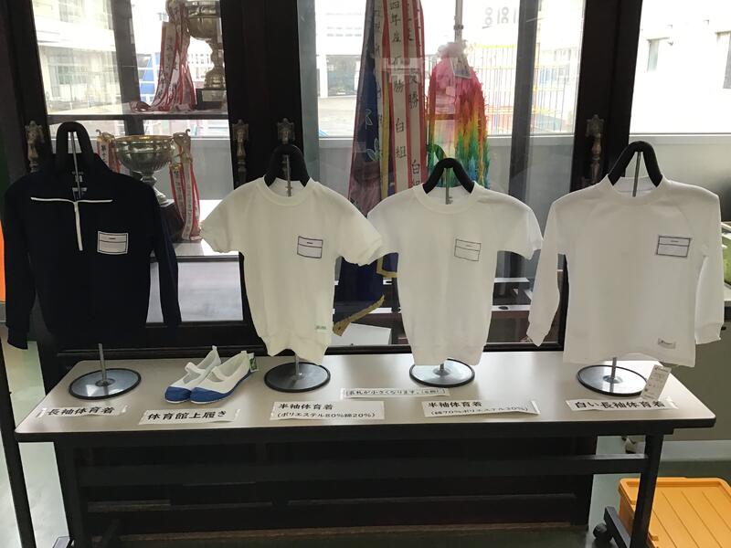 来年度から名札が変わる体育着と新たに導入する体育館用上履きを展示して、周知も図りました。