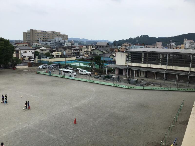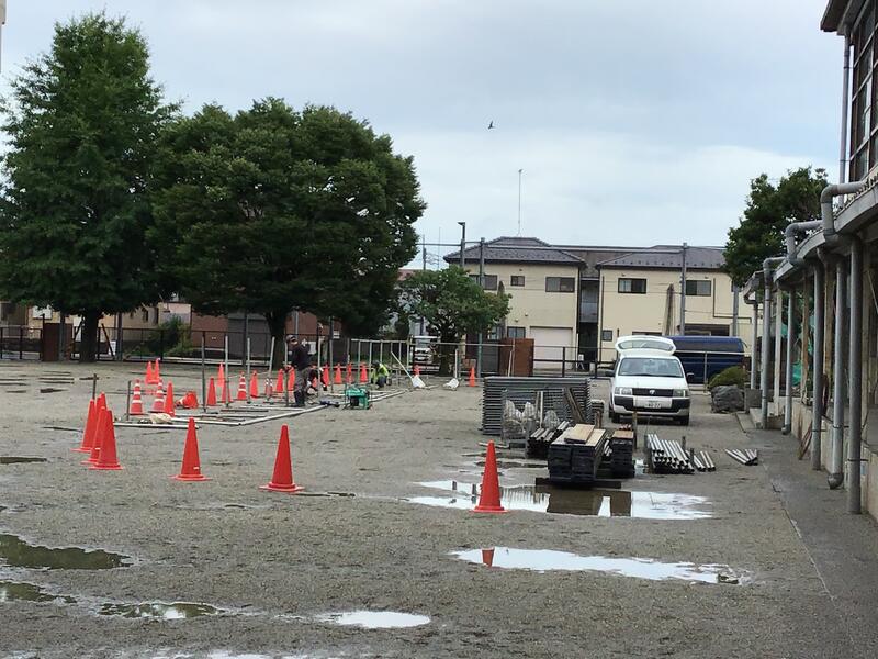 校庭西側のサッカーゴールは移動され、陸上競技用のトラックにフェンスがかかる状態です。
