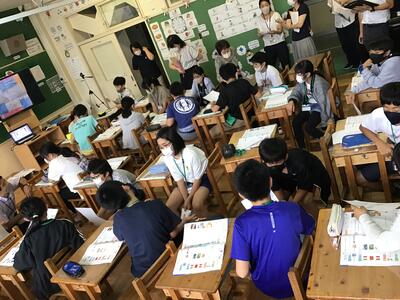 南校舎の一階を除く校舎の全ての教室を使って、11人ずつで編制された68もの班が、同時にゲームにチャレンジしたので、撮影が追いつきませんでした。「こんなチャレンジだったのね」と雰囲気を察していただければありがたいです。