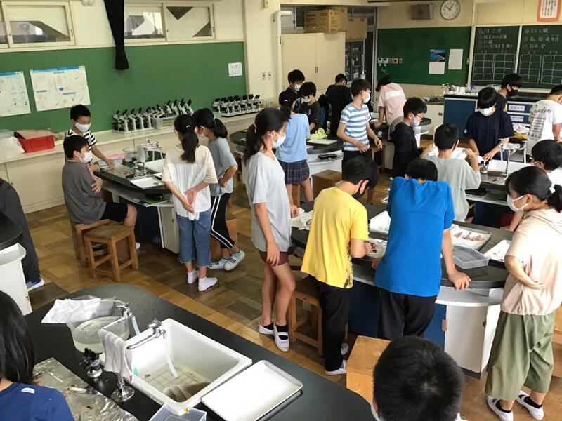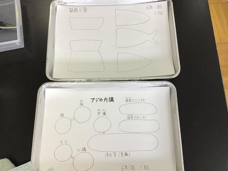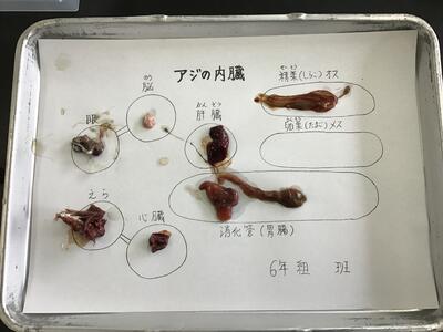 腹を開き、消化器官、心臓、肝臓、エラなどを見つけ部位ごとに並べて確認する実習でした。
