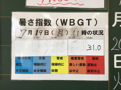 指数によって「積極的に水分補給」「積極的に休憩」「激しい運動は中止」「運動は原則中止」といった目安が示されているので、体育は、教員が計測器を携帯し数値を確認しながら授業を行います。業間や昼の休み時間、指数によっては天気が良くても、子供たちを屋外に出さないということもあります。校舎内は、エアコンがあるため本当に助かります。