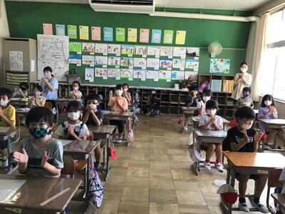 式は、校長の話、校歌静聴と続き終了しました。その後、子供たちは、児童指導主任の夏休みの生活上の注意点を聞き、1校時が終わりました。