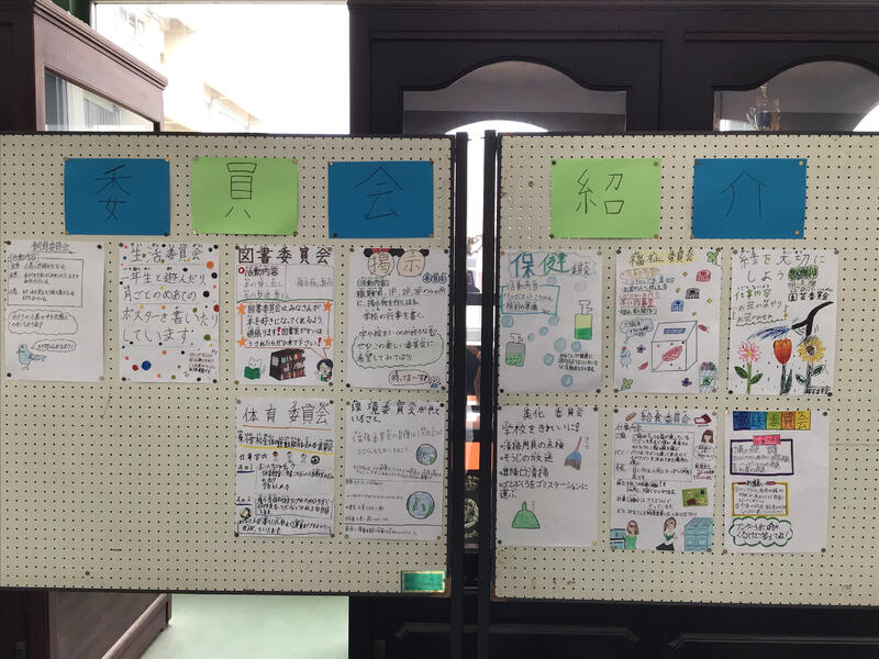 このところ毎日お昼の放送で「委員会活動」の紹介が放送されています。児童用玄関には各委員会のポスターが掲示されました。