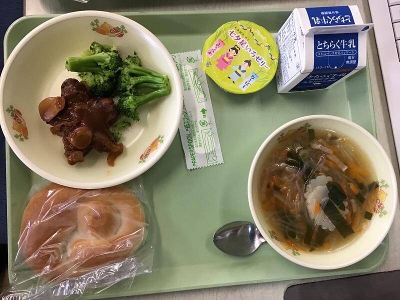 そして、給食の献立は「たなばた献立」、米粉パン、星形ハンバーグデミグラスソースがけ、ボイルブロッコリー、冬瓜(とうがん)スープ、たなばたゼリー、牛乳でした。